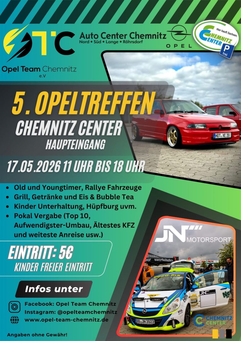 wir laden euch herzlich zum 5. Opeltreffen im Chemnitz Center ein! Ein Tag voller faszinierender Fahrzeuge, spannender Begegnungen und kulinarischer Genüsse erwartet euch.